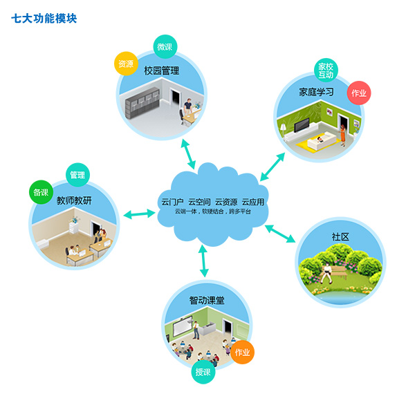 整合了課前、課中、課后、課外的所有教學(xué)環(huán)節(jié),利用現(xiàn)代化信息技術(shù)手段實(shí)現(xiàn)在線智能備課,課堂中的個(gè)性化授課,學(xué)生的富媒體作業(yè),匹配到課時(shí)微課,匹配教材的教學(xué)資源,智能家;(dòng)系統(tǒng),領(lǐng)導(dǎo)的數(shù)據(jù)管理系統(tǒng)。覆蓋教學(xué)中的備、授、輔、批、考五個(gè)環(huán)節(jié),節(jié)節(jié)有支持,環(huán)環(huán)有聯(lián)系,形成一體化教學(xué)工具、資源和數(shù)據(jù),實(shí)現(xiàn)真正的空間人人通。